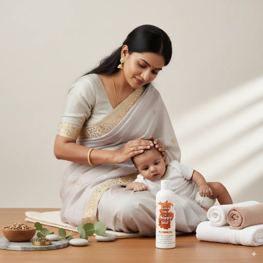 Mid-morning time is preferred (10 am – 12 pm). Take the required amount of oil in a bowl and warm the oil before use. The massage should be gently followed by a warm water bath. The baby should enjoy the massage time. Mother should sing mantras , shlokas , bhajans during massage time. Massage should be done by the mother only once she is ready to do baby chores. She can take help from other family members (not an external person) for the first few days. Apply plain coconut oil on the head. A 20 minutes massage is enough for the relaxation of the muscles and tissues, and nourishment of the skin. We recommend daily massage for the first 1 year of the child’s age and on alternate days till 2 years.