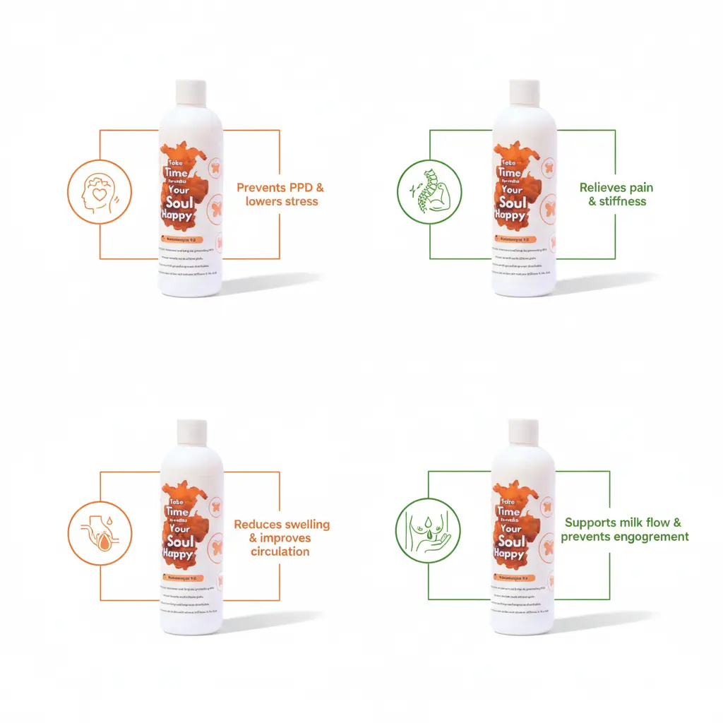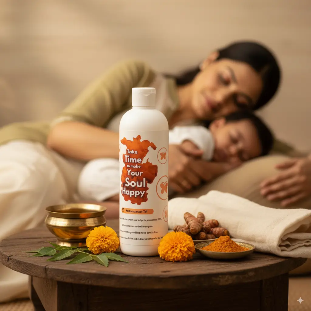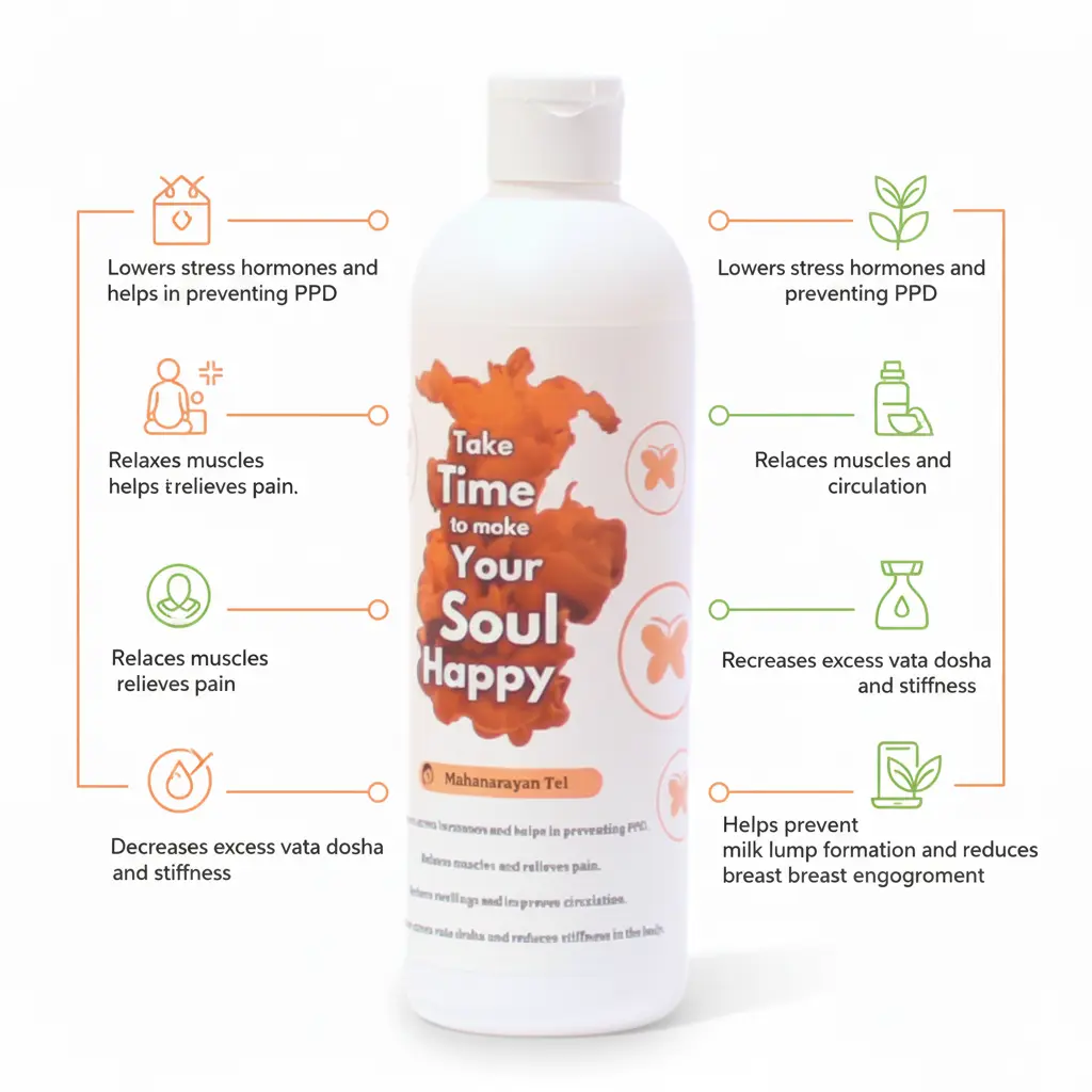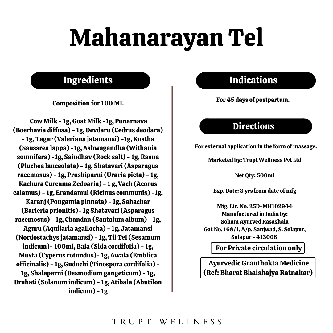 Mahanarayan tel is an Ayurvedic massage oil for the mother. The application of this oil during the postpartum period lowers stress hormones and helps in preventing PPD (postpartum depression). It relaxes muscles and relieves pain. Also reduces swelling and improves circulation.