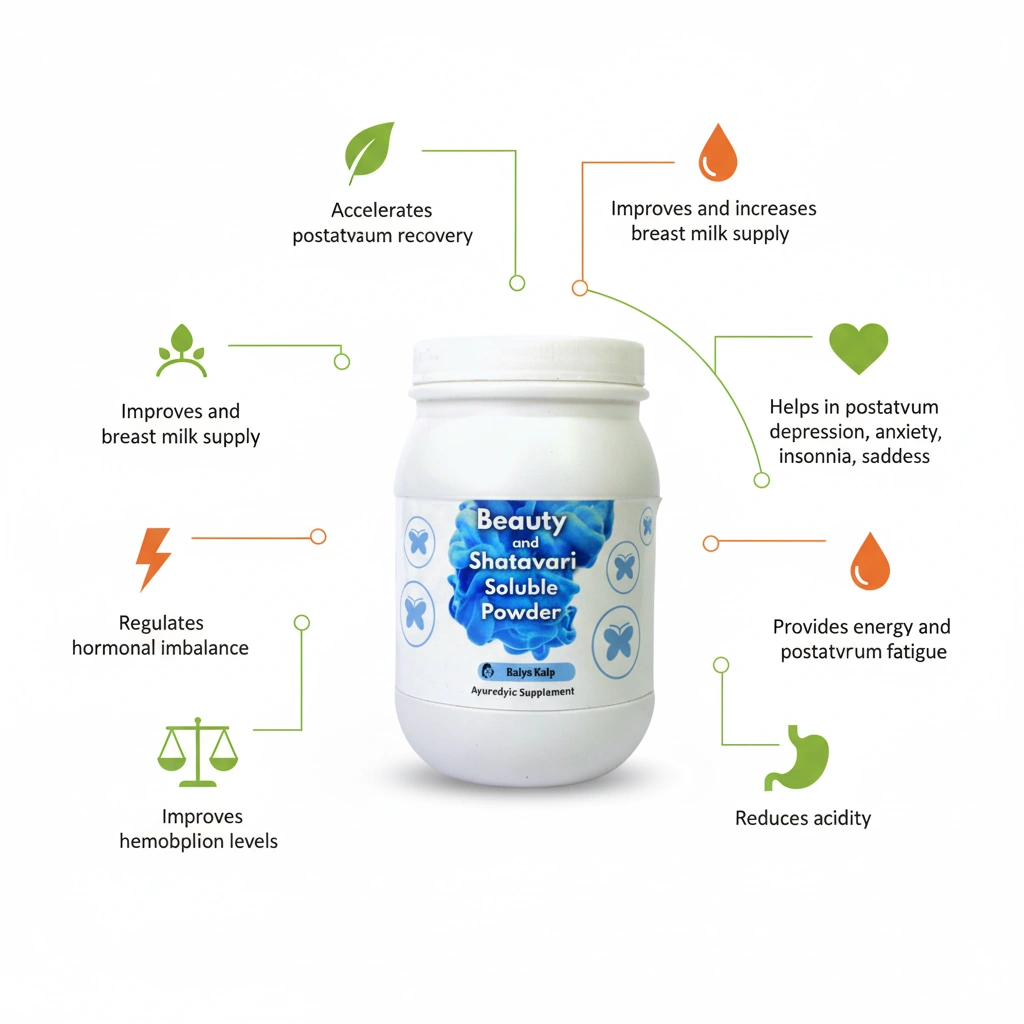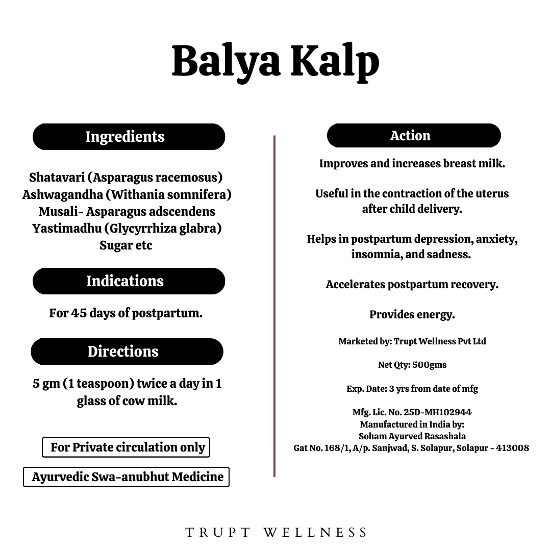 Balya Kalpa accelerates postpartum recovery. Improves and increases breast milk. Helps in postpartum depression, anxiety, insomnia, and sadness.