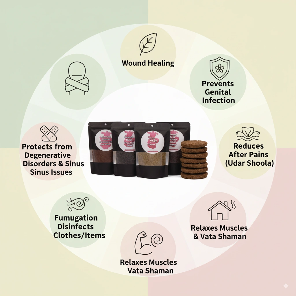• Yoni dhupan helps to prevent genital infection and puerperal sepsis. It also helps in wound healing in the perineal area.